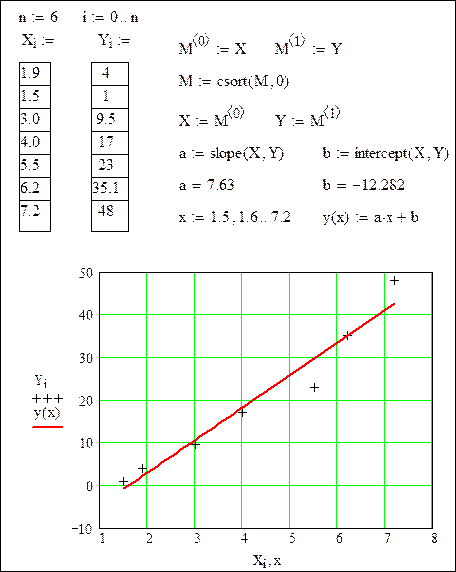 Экспериментальные данные могут быть заданы в виде таблицы n пар чисел Xi; Yi. Аппроксимировать их, значит построить функцию, которая пройдет как можно ближе к заданным точкам. Существует много численных методов решения этой задачи. Некоторые из них запрограммированы в пакете MathCad. На рис. 25 приведен пример линейной аппроксимации 7-ми пар чисел, занесенных в массивы Xi, Yi.