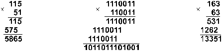 Ввиду чрезвычайной простоты таблицы умножения в двоичной системе, умножение сводится лишь к сдвигам множимого и сложениям.