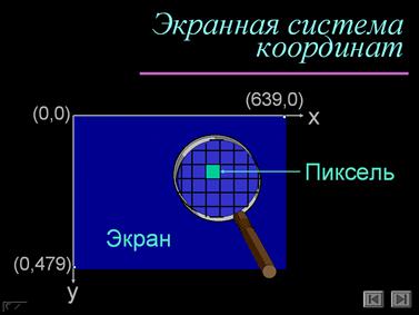 В графическом режиме экран разделяется прямоугольной сеткой, каждый элемент которой имеет свои координаты. Левый верхний угол экрана имеет координаты (0;0). Значение левой координаты (Х) увеличивается в горизонтальном направлении слева направо. Значение правой координаты (У) увеличивается в вертикальном направлении сверху вниз.
