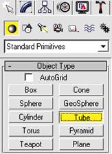 Перейдите во вкладку Create в выпадающем списке выберите Standard Primitives и создайте объект Tube.