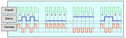 Манчестер-II (Manchester-II) Логическому нулю соответствует переход на верхний уровень в центре битового интервала, логической единице - переход на нижний уровень.