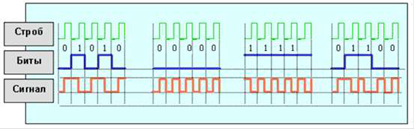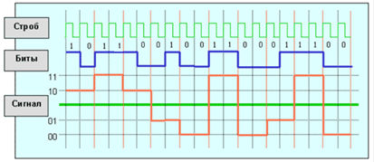 Передача двух битов одновременно обеспечивает уменьшение в два раза частоты изменения сигнала.