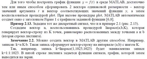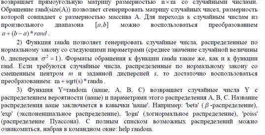 Функции в пакете MATLAB – это имеющие специальные имена объекты, выполняющие определенные преобразования над своими аргументами и при этом возвращающие результаты этих преобразований [6]. При этом результат вычисления функции с одним переменным параметром подставляется на место ее вызова, что позволяет использовать функции в математических выражениях. Например: 2*sin(pi/2). Функции, в общем случае, имеют список аргументов (параметров), заключенные в круглые скобки. Если функция возвращает несколько значений, то она записывается в виде: [Y1, Y2, ...]=func(X1, X2, ...), где Y1, Y2, ... – список выходных аргументов и X1, X2, ... – список входных аргументов (параметров), func – имя функции. Со списком элементарных функций можно ознакомится, выполнив команду help elfun в командном окне (Command window).