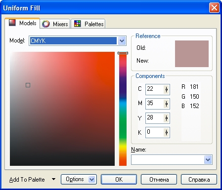 2. Раскрыть на вкладке Models (Модели) список Model (Модель) всех моделей цвета, с которыми работает CorelDRAW. Выбрать CMYK и установить в счетчиках: С — О, М — О, Y — О, К — 100. Щелкните на кнопке ОК.