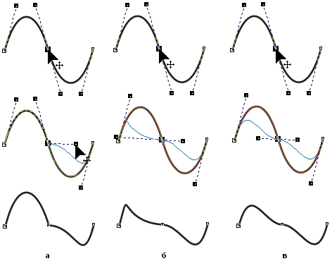 Рис. 5.3. Перетаскивание направляющих точек узлов различных типов: точки излома (а). сглаженного узла (б), симметричного узла (в)