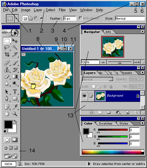 Заголовок (8) содержит наименование и масштаб изображения, имя текущего слоя или идентификатор Background(Фон) и информацию о режиме изображения.