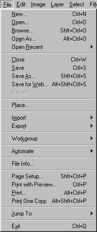 Команды из меню File(Файл) применяются в тех случаях, когда необходимо создать, открыть, разместить, закрыть, сохранить, отсканировать, импортировать или экспортировать, напечатать изображение, передать файл по сети, автоматизировать некоторые операции и, наконец, выйти из программы Photoshop (рис. 7.31). Воспользуйтесь подменю File > Jump to(Файл > Перейти в), чтобы перейти во вспомогательные приложения, такие как ImageReady или GoLive.