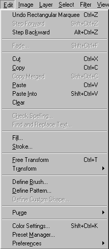 В меню Edit(Правка), показанном на рис. 7.32, содержатся команды редактирования изображения: копирования, трансформации, вставки и переопределения цветов изображения, а также команды создания кисти определенного размера и формы, различных узоров и фигур. Команды подменю Fade(Ослабить) позволяют ослабить эффект от многих операций (например, последнего примененного фильтра, команд корректировки или рисования каким-либо инструментом). Команды подменю Purge(Очистить) освобождают память. Также с помощью меню Editможно открыть диалоговые окна Color Settings(Характеристики цвета), Preset Manager(Менеджер настроек) и Preferences(Установки).