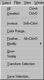 Команда All (Все) из меню Select(Выделить) - рис. 7.35 - выделяет весь слой целиком. Команда же Deselect(Снять выделение), наоборот, снимает выделение со всех ранее выделенных областей. Команда Reselect(Восстановить выделение) опять выделяет ту область, к которой была применена последняя команда Deselect.Команда Color Range(Диапазон цветов) создает выделение с учетом цвета. Другие команды этого меню расширяют, сжимают, сглаживают или растушевывают границы выделенной области, а также сохраняют выделенные области в каналах или загружают области из каналов.