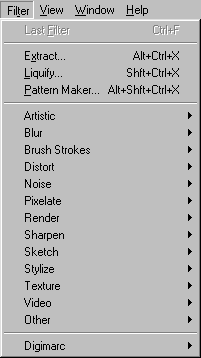 По сравнению с предыдущей версией программы в это меню из меню Imageперемещены две команды. Команда Extract(Извлечь) позволяет создавать выделенные области сложной формы. Команда Liquify(Исказить) сдвигает точки изображения в каком-либо направлении.