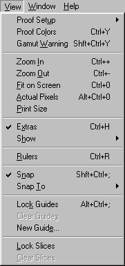 Команды меню View(Вид), показанного на рис. 7.37, контролируют, что отображается и что не отображается на экране. Команда Gamut Warning(Предупреждение о гамме) выделяет те цвета, которые не будут выведены при четырехцветной печати. Команды подменю Proof Setup(Установки пробного отпечатка) позволяют увидеть, как будет выглядеть изображение при печати в различных режимах. Другие команды из меню Viewуправляют масштабом изображения, а также выводят на экран линейки, координатную сетку, вспомогательные линии и области, на которые поделено изображение.