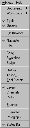 Команды из меню Window(Окно), которое представлено на рис. 7.38, управляют показом или скрытием различных палитр. В этом меню также расположен список открытых изображений, и любое из них можно сделать активным.