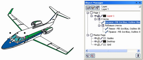 В работе над рисунком группы применяются очень часто. Основное их назначение — предотвращать случайное смещение отдельных объектов, образующих фрагмент изображения, относительно друг друга. Создание групп позволяет упростить операции копирования и размещения фрагментов изображения. Диспетчер объектов позволяет давать главным и вложенным в них дочерним группам объектов осмысленные имена, что значительно упрощает поиск объектов, соответствующих той или иной части изображения.