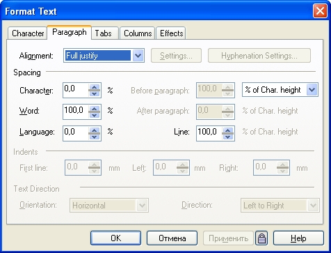 Рис. 13.8. ВкладкаParagraphдиалогового окнаFormat Text для простого текста