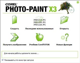 Corel Photo – Paint – это мощный растровый графический редактор, который является аналогом Adobe Photoshop. Мы будем рассматривать его версию X3. Другие его версии от этой отличаются не существенно. При запуске Corel Photo – Paint возникает окно, показанное на рис. 14.1. Предлагается либо создать новый графический файл, либо открыть один из последних использованных графических файлов, либо открыть другой графический файл, получить изображение со сканера, либо читать учебник CorelTUTOR, либо прочитать о новых функциях Corel Photo – Paint X3 по сравнению с другими его версиями.