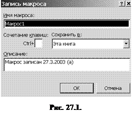 В поле Имя макроса введите имя для макроса (рис. 27.1). Первым символом имени макроса должна быть буква. Остальные символы могут быть буквами, цифрами или знаками подчеркивания. В имени макроса не допускаются пробелы; в качестве разделителей слов следует использовать знаки подчеркивания.