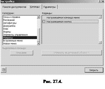 3. Если на панели инструментов отсутствует кнопка, которая должна запускать макрос, выберите параметр Макросы в списке Категории на вкладке Команды. Из списка Команды перетяните с помощью мыши настраиваемую кнопку на панель инструментов (рис. 27.4).