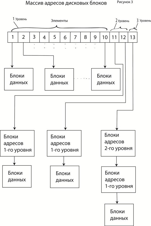 Массив имеет фиксированный размер и состоит из 13 элементов. Первые 10 элементов содержат адреса 1 уровня и адресуют непосредственно блоки хранения данных файла. Одиннадцатый элемент содержит адреса 2 уровня и адресует блоки, в свою очередь содержащий адреса 1 уровня, которые адресуют блоки хранения данных. Двенадцатый элемент обеспечивает такую же адресацию как и 11 элемент. Тринадцатый элемент используется для тройной косвенной адресации, когда для нахождения адреса блока хранения данных файла используется три дополнительных блока адресов.