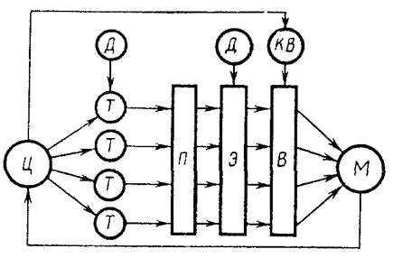 На основе исходных данных Д, которые известны из анализа внешней системы, накладываемых на систему ограничений, и на основе цели функционирования формулируются исходные требования Т к модели системы S. На базе этих требований ориентировочно формируются некоторые подсистемы П, элементы Э и осуществляется наиболее сложный этап – выбор В составляющих системы, для чего используются специальные критерии выбора (КВ).