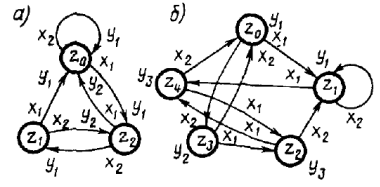 Рис. 3.4. Графы автоматов Мили (а) и Мура (б).