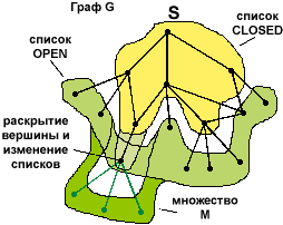 Эта стратегия запоминает все исследуемые пути. Они сохраняются в графе, вершинами которого являются состояния системы, а дугами – продукционные правила. Это неявно заданный граф, т.к. он задан начальной вершиной и правилами построения. При этом решается задача – найти путь между заданной (начальной) и целевой вершинами.