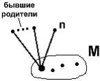 7. Ввести указатель к n от тех элементов из M, которых еще в графе нет, добавить эти элементы в OPEN. Для каждого элемента из M, который уже есть в OPEN или CLOSED (вместе это граф G), решить, нужно ли переориентировать указатель на n (если путь через новую вершину n короче, то необходимо поменять родителей (Рис.22). Для каждого элемента из M, который находится в CLOSED, принять решение относительно ее потомка и так до полной перестройки графа.