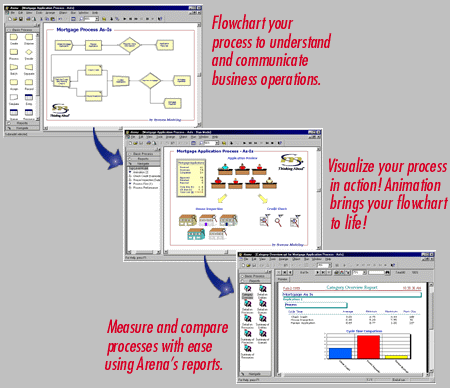 В Arena все функции, необходимые для эффективного проведения моделирования, собраны удобную интегрированную среду. Input Analyzer позволяет адаптировать ранее определенные структуры данных к реальным входным данным. Output Analyzer, средство полного качественного анализа, дает возможность отображать и сравнивать данные, собранные в процессе имитации. С помощью Scenario Manager можно запустить целую серию имитаций, а потом проанализировать их результаты. Arena снабжена подробной системой интерактивной помощи и демонстрационными примерами