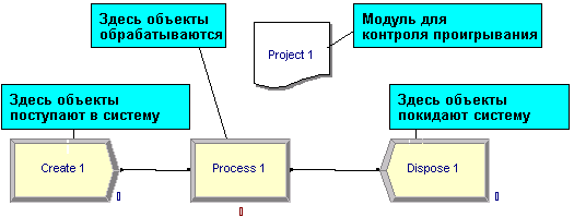 Перенесем из панели инструментов в рабочее пространство модели по одному модулю Create, Dispose и Process. Связи между модулями устанавливаются автоматически (хотя могут быть и переопределены вручную). Модуль Create является источником сущностей в системе. Так, например, если описывается изготовление изделий, то модуль Create может описывать поступление заготовок на конвейер. Модуль Process отвечает за обработку сущностей. Например, он может имитировать станок, обрабатывающий заготовки. Модуль Dispose является стоком сущностей из системы. Он может моделировать снятие готовых изделий с конвейера.