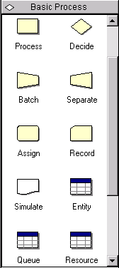 Для построения моделей Arena имеет набор средств, которые включают палитру инструментов, набор гидов и др. Для создания модели сначала нужно щелкнуть по кнопке New на панели инструментов. Слева появляется палитра инструментов (рис. 27) , которая содержит два типа модулей.