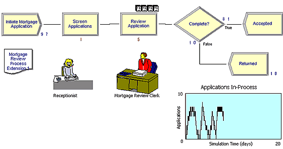 Модель показывает систему обработки документа (закладной). Сначала документ регистрирует секретарша (иконка слева в нижней части рисунка, затем просматривает клерк (иконка справа). Затем клерк либо принимает документ, либо возвращает. Очередь документов показывается в виде набора иконок сверху от процесса Review Application и в виде графика в правой нижней части рисунка. Иконки, отображающие секретаря и клерка могут быть разными в зависимости от состояния (занят – ожидает), следовательно, модель может быть анимирована.