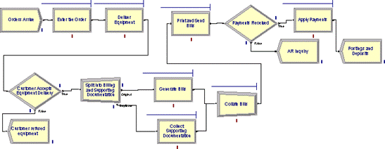 Имитационная модель компании Systems Modeling включает следующие основные элементы: источники и стоки (Create и Dispose), процессы (Process) и очереди (Queue). Источники - это элементы, от которых в модель поступает информация или объекты. Скорость поступления данных или объектов от источника обычно задается статистической функцией. Сток - это устройство для приема информации или объектов. Понятие очереди близко к понятию хранилища данных - это место, где объекты ожидают обработки. Времена обработки объектов (производительность) в разных процессах могут быть разными. В результате перед некоторыми процессами могут накапливаться объекты, ожидающие своей очереди. Часто целью имитационного моделирования является минимизация количества объектов в очередях. Тип очереди в имитационной модели может быть конкретизирован. Очередь может быть похожа на стек - пришедшие последними в очередь объекты первыми отправляются на дальнейшую обработку (LIFO: last-in-first-out). Альтернативой стеку может быть последовательная обработка, когда первыми на дальнейшую обработку отправляются объекты, пришедшие первыми (FIFO: first -in-first-out). Могут быть заданы и более сложные алгоритмы обработки очереди. Процессы - это аналог работ в функциональной модели. В имитационной модели может быть задана производительность процессов.