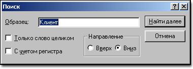 Для первоначального поиска подстроки необходимо воспользоваться пунктом меню Search->Find, нажать комбинацию клавиш Ctrl+F или нажать на кнопку панели инструментов редактирования. После этого будет выведено стандартное диалоговое окно WINDOWS для поиска подстрок (см. рис.36), где пользователю необходимо указать подстроку для поиска, задать параметры поиска и нажать кнопку Найти далее (Find Next).