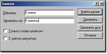 После этого будет выведено стандартное диалоговое окно WINDOWS для замены подстрок (см. рис.37), где пользователю необходимо указать подстроку для поиска, задать параметры поиска и нажать кнопку Найти далее (Find Next), Заменить (Replace) или Заменить все (Replace All).