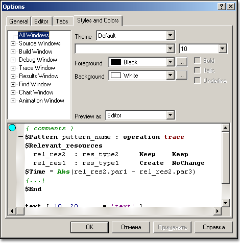 На базе любой из подготовленных заранее тем пользователь может разработать свою тему. Для этого в левой верхней части закладки приведен список элементов цветового выделения, для которых могут быть изменены параметры отображения. Изменение параметров осуществляется путем выбора элемента из списка и выбора для него цветов и шрифта. Изменения отображаются в окне просмотра.