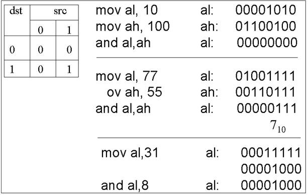 Логическое «И». Инструкция and выполняет операции логическое «И» двух операндов (байтов или слов) и возвращает результат в операнд-приемник. Бит результата устанавливается в 1, если установлены в 1 оба соответствующих ему бита операндов, и устанавливаются в 0 противном случае (рисунок 4.2).