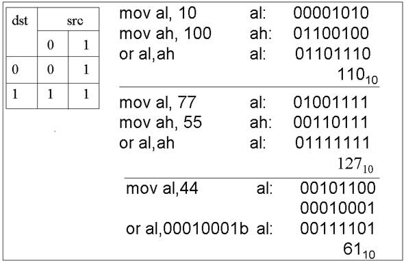 Логическое «ИЛИ». Инструкция or выполняет операции логическое «ИЛИ» двух операторов (байтов или слов) и помещает результат на место операнда-приемника. Бит результата устанавливается в 1, если равен 1 хотя бы один из двух соответствующих ему битов операндов и устанавливается в 0 в противном случае (рисунок 4.3).