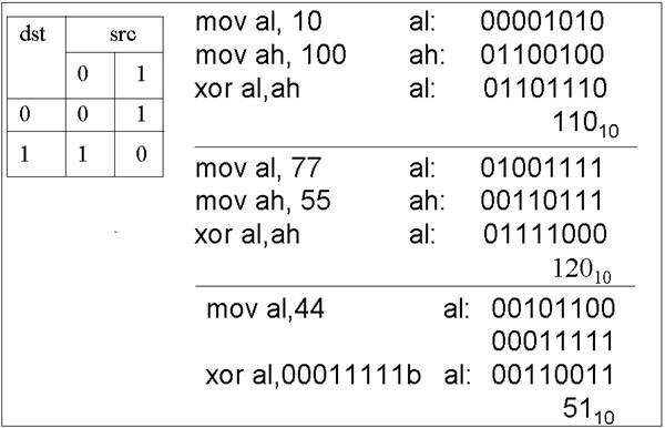 Логическое «Исключающее ИЛИ». Инструкция xor выполняет операцию логическое исключающее ИЛИ двух операндов и помещает результат на место операнда-приемника. Бит результата устанавливается в 1, если соответствующие ему биты операндов имеют противоположные значения, и устанавливается в 0 в противном случае (рисунок 4.4).