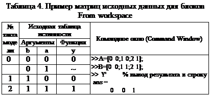 а) From workspace (из рабочего поля) – находится в подразделе Sources (источники) раздела Simulink (окно Simulink Library Browser). Блок читает значения аргументов ФАЛ (входные двоичные наборы) из командного окна MATLAB.