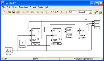 Может случиться, что таблица выходов совпадает с «осциллограммами» лишь через некоторое количество тактов. Это вполне соответствует реальной ситуации, поскольку в момент запуска устройство устанавливается в произвольное состояние, что обусловливает переходный процесс.