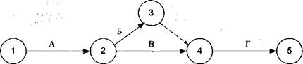 2. Если для начала работы «Г» необходимо выполнить работы «А» и «Б», а для начала работы «В» - только работу «А», то вводится зависимость и дополнительное событие (рис.6.3.).