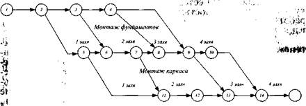 4. В сетевом графике при поточной организации строительства вводятся дополнительные события и зависимости (рис. 6.5.).