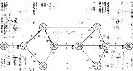 Далее определяются критические работы. Критический путь завершает событие (10), в нижнем секторе которого записано 9. Следовательно, событие (9) также находится на критическом пути, в нижнем секторе которого записано 8, т.е. критический путь проходит через событие (8), в нижнем секторе которого стоит цифра 6, значит и событие (6) лежит на критическом пути и т.д. до исходного события. Критический путь в рассматриваемом примере проходит события (1,2,3,5,6,8,9,10), критические работы: (l,f); (2,3); (3,5); (5,6); (6,8); (8,9); &10).