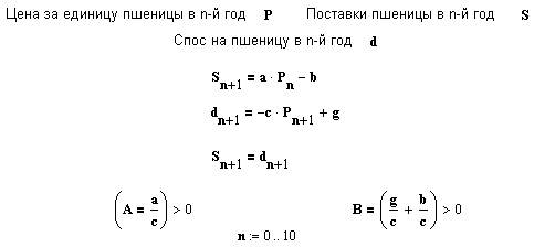 Произвести вычисление на MathCAD’е в соответствии вышеуказанному решению модели спроса-предложения, узнать оптимальную цену на пшеницу за определенное время, изменяя параметры: