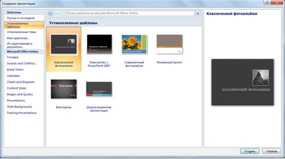 · на основе шаблона выбранного из категории шаблона, с помощью команды Установленные шаблоны;