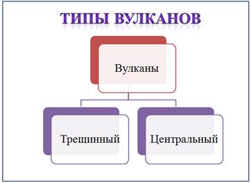 Создайте пятый Пустой слайд. Название слайда «Типы вулканов» создаете с помощью фигурного текста WordArt. Параметры текста введите по своему усмотрению. Здесь же создайте организационную диаграмму, состоящую из двух уровней и трех блоков, и заполните ее как показано на рисунке 8. Произведите форматирование блоков диаграммы. Щелкните левой кнопкой мыши на диаграмме и перейдите на появившуюся вкладку Конструктор. В группе Макеты выберите макет Иерархия. В группе Стили Smart Art выберите Полированный. Щелкните на кнопке Изменить цвета и выберите из коллекции цветовую схему из области Цветной.