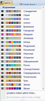 Для применения к презентации новой цветовой схемы выполните команду Дизайн → Темы → Цвета. В раскрывшейся коллекции цветовых комбинаций (рис. 21) выберите любую цветовую схему и щелкните по ней мышью.