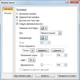 области слайда. В появившемся контекстном меню выберите пункт –Формат фона. В открывшемся диалоговом окне Формат фона на закладке Заливка поставьте переключатель в положение Градиентная заливка (рис. 22).В строке Название заготовки выберите «Мох», в строке Тип – «Прямоугольный», в строке Направление – «Из центра», нажмите кнопку Закрыть.