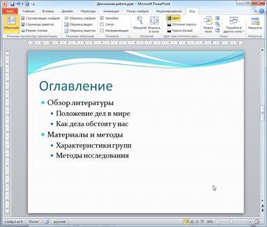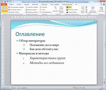 Основными текстовыми элементами презентаций являются списки. В отличие от Word списки PowerPoint изначально предполагаются многоуровневыми, что вносит некоторую специфику в приемы их форматирования. Чтобы приукрасить списки презентации, созданной на предыдущем занятии, выполните следующие шаги. Откройте презентацию Дипломная работа.ррt. Перейдите к четвертому слайду, показанному на рис. 5. На этом слайде расположен двухуровневый список.