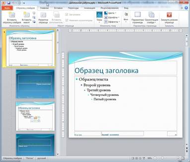 Выберите команду ВидàОбразец слайдов. Появится образец слайдов с пятью местозаполнителями и лента инструментов Образец слайдов с несколькими кнопками, позволяющими вводить новый образец, удалять, сохранять и переименовывать его (рис.8). С помощью приемов, описанных, можно редактировать образец слайда, изменять размеры местозаполнителей, заливку, рамку и шрифт, а также маркеры списков. Выполненное форматирование подействует на все слайды презентации, кроме титульного.