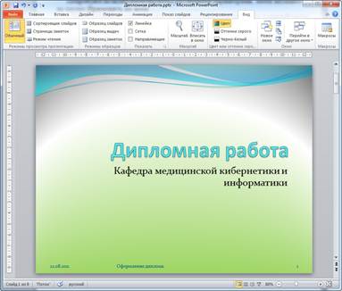 Выберите положение переключателя Автообновление, чтобы выводилась дата последнего обновления презентации. В списке Язык выберите пункт Русский. Установите флажок Номер слайда, чтобы добавить порядковый номер слайда. В поле Нижний колонтитул введите текст «Оформление диплома», который будет теперь появляться на каждом слайде. Щелкните на кнопке Применить ко всем. Вернитесь в обычный режим просмотра слайдов. Обновленный первый слайд показан на рис. 9.
